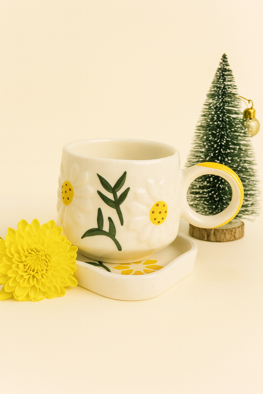 A charming hand-painted ceramic cup adorned with daisy motifs and warm yellow accents. Perfect for brightening your mornings with a cozy, cheerful sip.